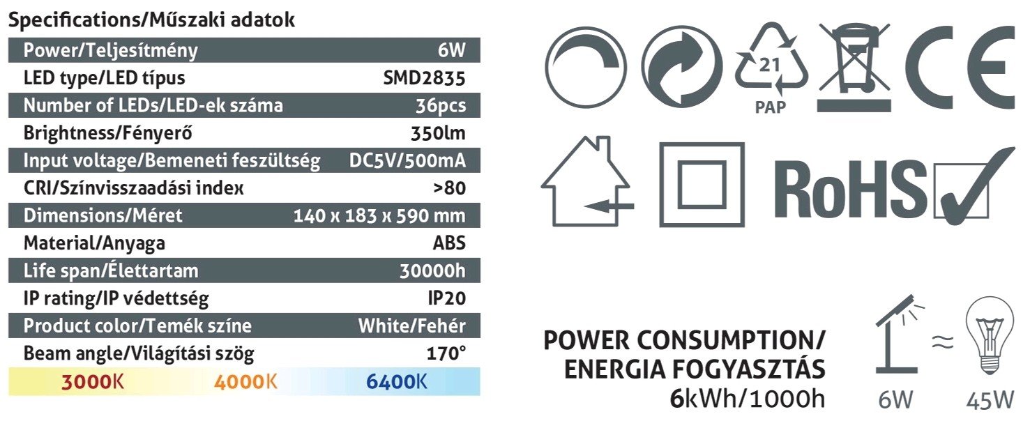| Λειτουργίες | Τρία χρώματα Λειτουργίας (WW/NW/CW), ρυθμιζόμενη φωτεινότητα 3 βήματα, κουμπί αφής,Οθόνη LCD με Ρολόι, Ξυπνητήρι, Ημερολόγιο, Θερμοκρασία |