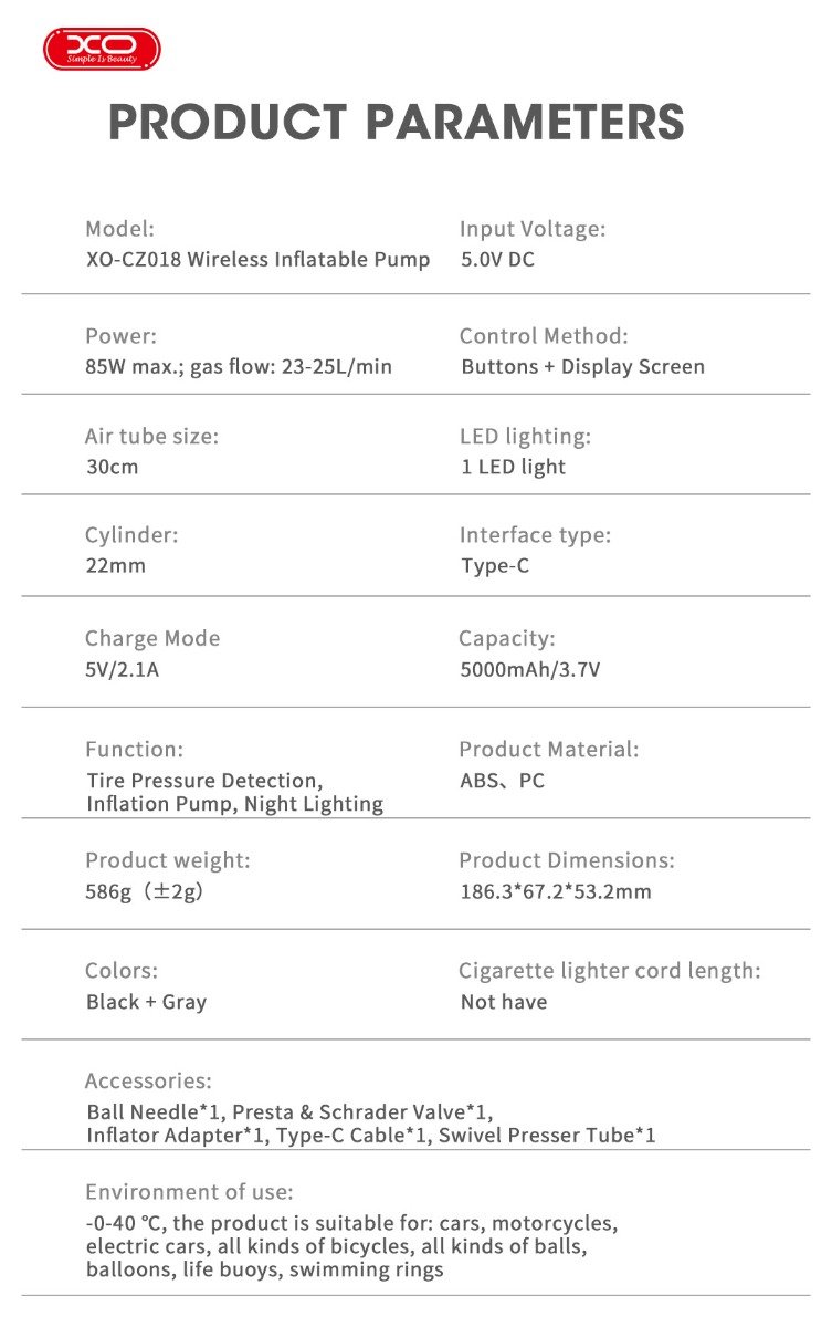 • Μοντέλο: XO-CZ018 Wireless Inflatable Pump